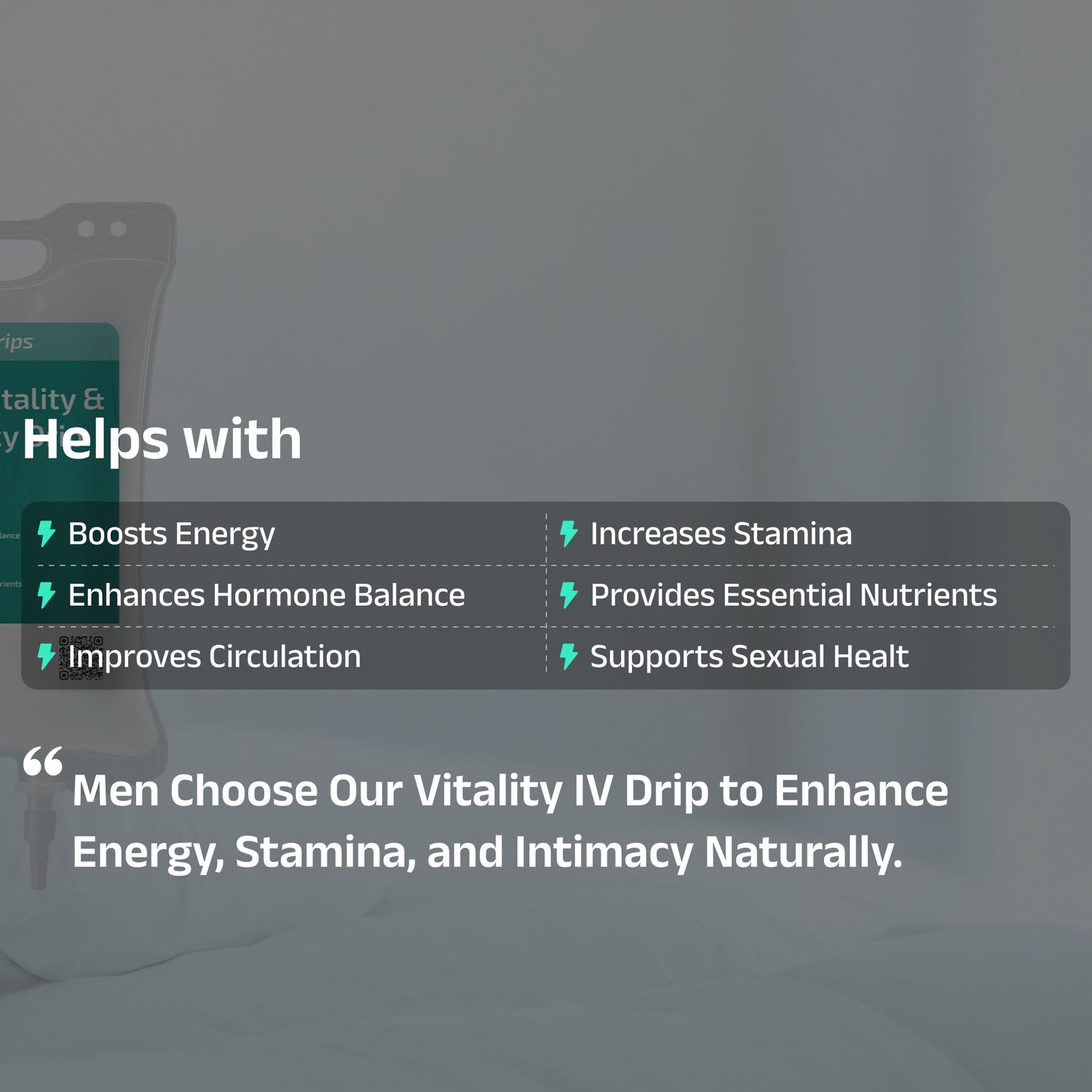 Specialized IV therapy formulated for men to enhance vitality, support hormonal balance, and boost energy & intimacy. Ideal for fatigue, low libido, high stress, or wellness enhancement.